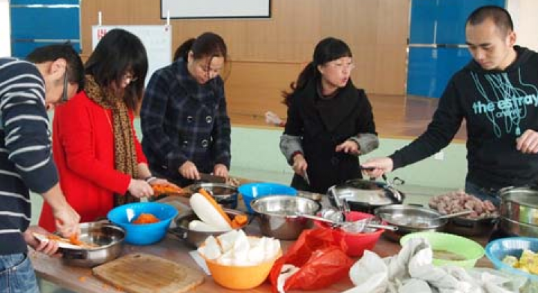 2011年12月31日,按照公司的传统,集团全体员工喜集一堂包饺子迎新年。平日里的职场精英、白领丽人们,今天都系上围裙、拿起菜刀端起面盆,切菜、剁馅、和面、配料、煮汤、调味,各展神通,顿时让庄严的会议室变得热闹非常。